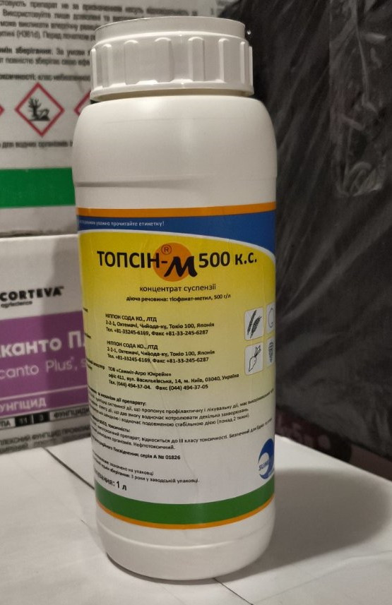 Механізм дії фунгіциду Топсін М 500 КС: Топсін М швидко поглинається листовою поверхнею і перерозподіляється в рослині. Тіофанат-метил працює у двох основних напрямках: гальмує поділ клітинного ядра, зменшує ріст гриба, зупиняє дихання, що, як наслідок, затримує вироблення мікотоксинів. Таким чином фунгіцид Топсин М має лікувальну, профілактичну та викорінювальну дію, що дає змогу ефективно боротися з хворобами.
